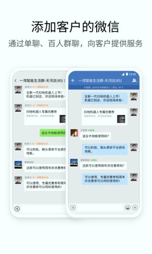 添加客户微信,通过单聊、百人群聊,还提供服务,发表内容到客户的微信朋友圈,更有小程序、结算等能力。