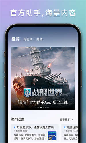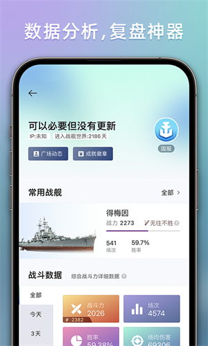战舰助手是一款专注于战舰世界游戏的功能强大且易于使用的游戏助手,玩家能够在这里轻松查看各种详细的游戏数据,通过其内的多种版块内容,确保他们可以得到全面的信息支持。玩家能够获得想要获取的战舰的各种信息,寻找强大的对手来提升自己的战斗力。为玩家带来了数据复盘功能,帮他们找出关键问题所在,进一步提升游戏技巧和策略,提前掌握最新的新闻资讯,使他们时刻保持在游戏世界的前沿。