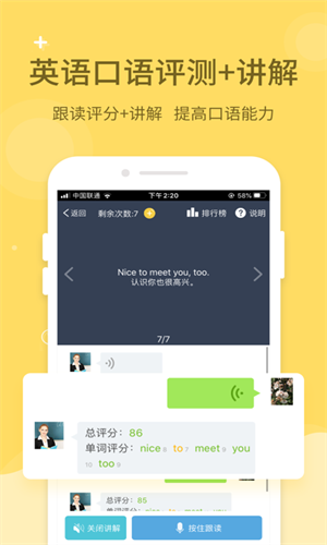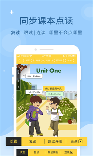 1、免费课本点读功能,如复读、跟读、连读、口语评测和纠音,自定义选择范围反复朗读。