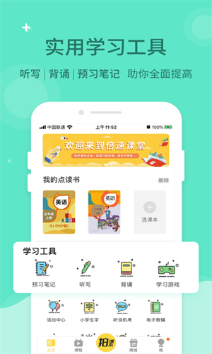 3、配套的动画课程、预习课程、听写和背诵功能,一键跳转的点读页面,让学生巩固学习。