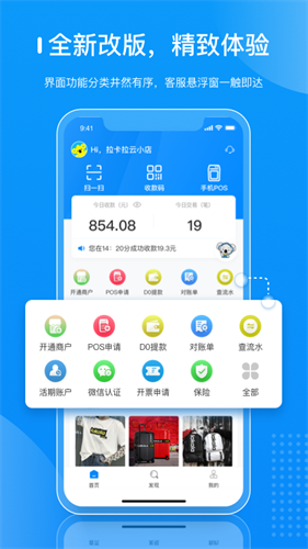 智能识别就能验证,提高你的额度,并且还支持账本的实时查询,满足你和商家的对账,多样的收款,并且还可以进行推送。