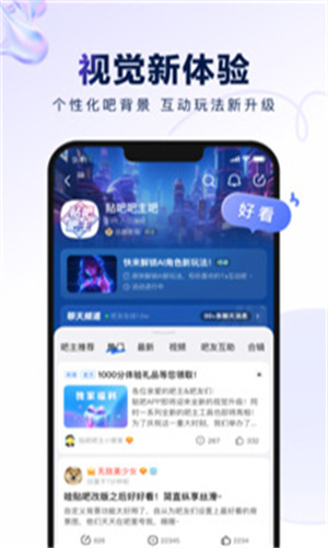 百度贴吧最新版是一款活力十足的基于兴趣的社交应用,一键畅享各种有趣的内容,这个全新的APP以其简单、轻巧和快速的特点脱颖而出,汇集了各种各样的圈子,为他们带来丰富多样的互动交流机会,还带来了观看有趣视频资源的机会,并通过个性化的推荐与展示呈现精彩纷呈的资讯内容,无需繁琐的步骤,只需要轻按一下,即可进入这个精彩世界,找到对应的圈子,一键搜索,你就能发现许多同样有兴趣的人,和他们一起畅所欲言,分享你的见解和快乐。