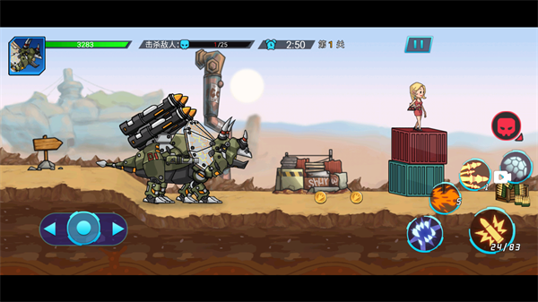 恐龙机甲射手是一款精彩刺激的横版射击游戏,以机甲战斗为主题,让玩家在恐龙世界中体验全新的游戏感受。此游戏采用全新的物理引擎,呈现出精致逼真且富有科技感的游戏画面,让玩家如置身于恐龙机甲重重围困之中,寸步难行。炫酷技能加上超级科技感,让玩家迷醉其中,难以自拔。恐龙与机甲的完美结合!机械坚硬的装甲,金刚不会的利爪,可以让你疯狂的撕咬敌人。