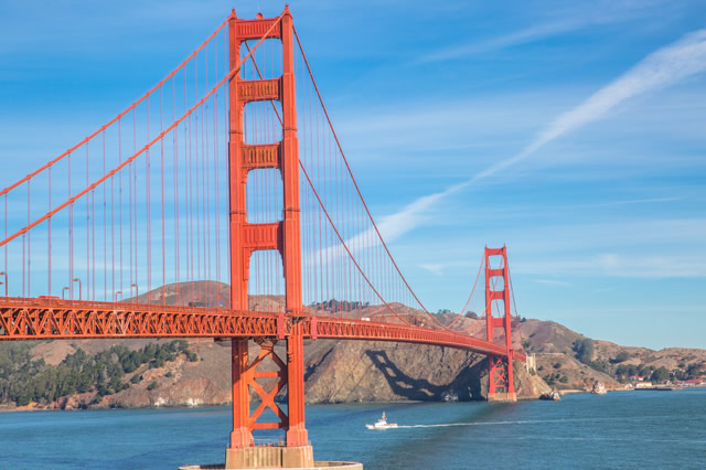 金门大桥又称“金门海峡大桥”,是美国境内连接旧金山市区和北部的马林郡的跨海通道,是美国旧金山市的主要象征,也是近代桥梁工程的一项奇迹。旧金山金门大桥由桥梁工程师约瑟夫·斯特劳斯设计,于1933年1月5日动工兴建,北起加利福尼亚州,上跨金门海峡,南至旧金山半岛;线路全长2780米,主桥全长1967.3米,桥面为双向六车道城市主干线;由主桥、引桥、高架桥、两座桥塔、锚碇、悬索、吊索、引桥及各立交匝道组成。 查看详细